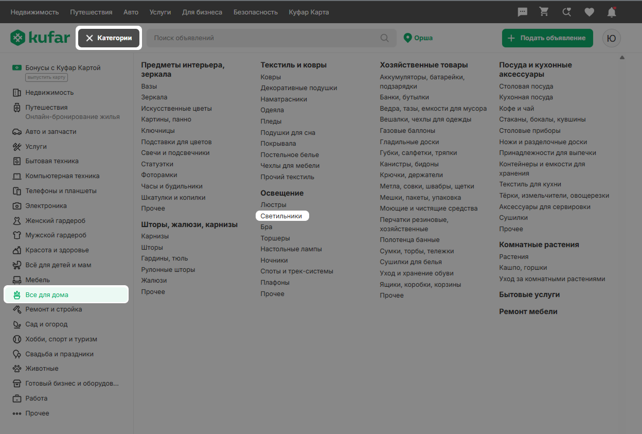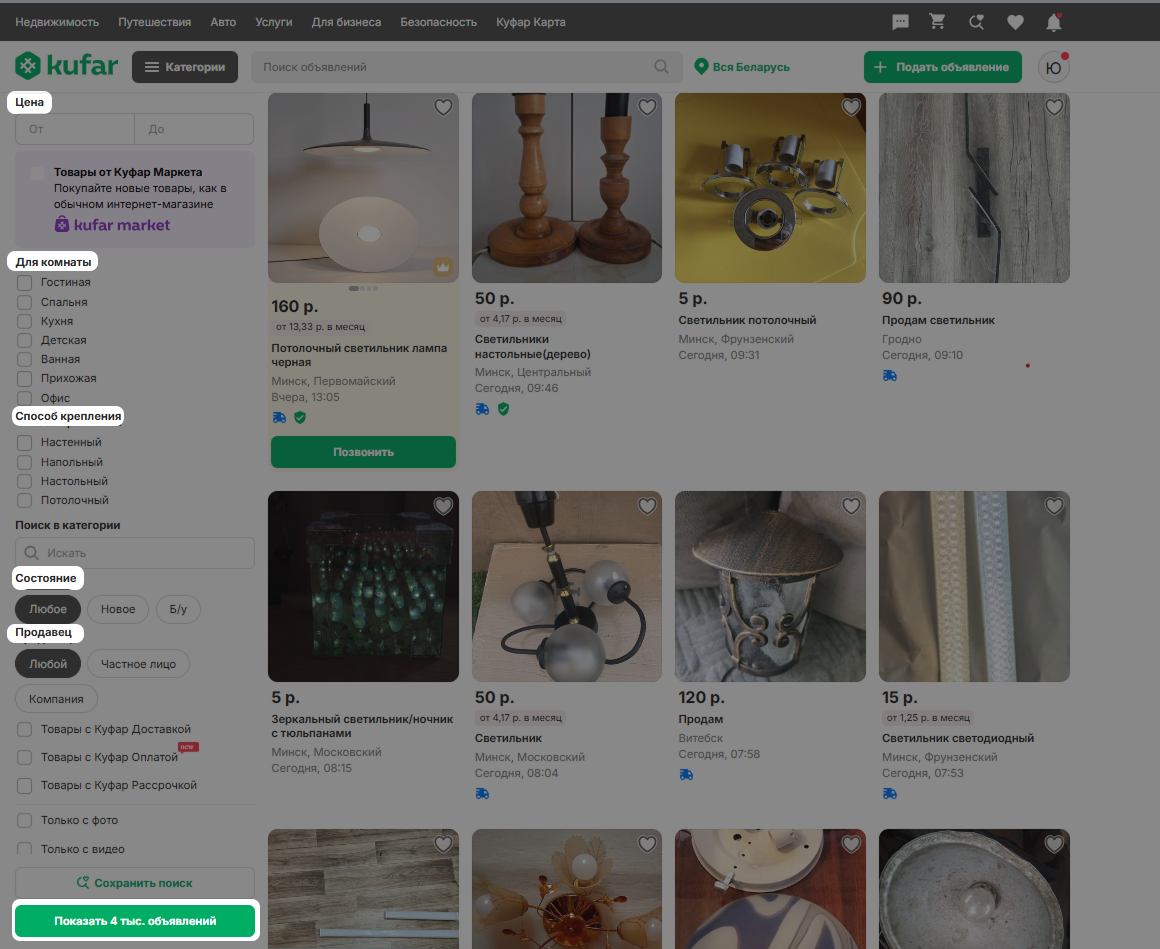Чтобы отсортировать объявления в соответствии с определёнными параметрами, вы можете воспользоваться фильтрами в категориях.