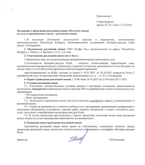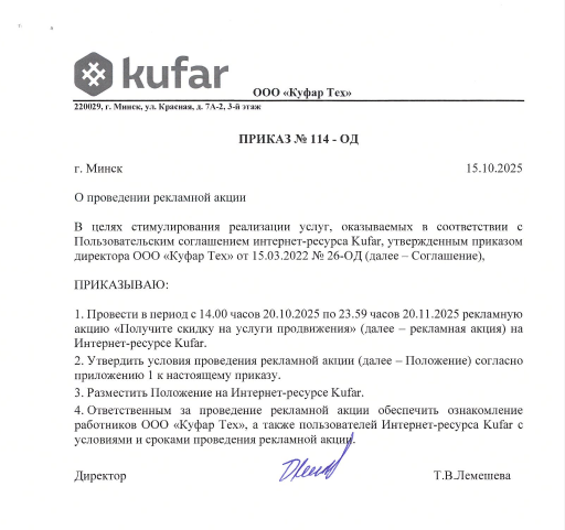 Приказ о проведении рекламной акции в период с 14:00 20.10.2025 по 23:59 20.11.2025 Последние изменения: 22.10.2025 Помогла ли вам статья?