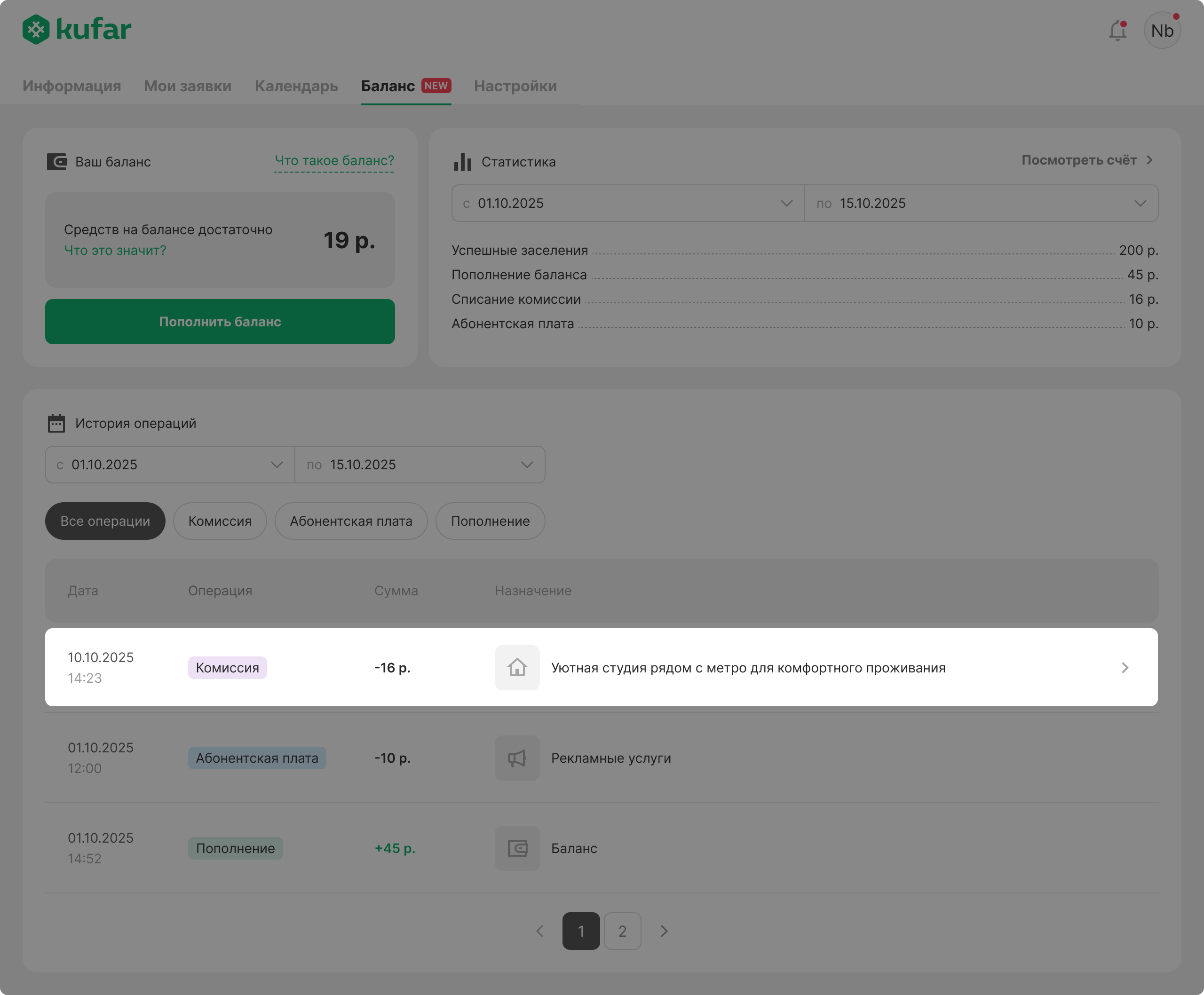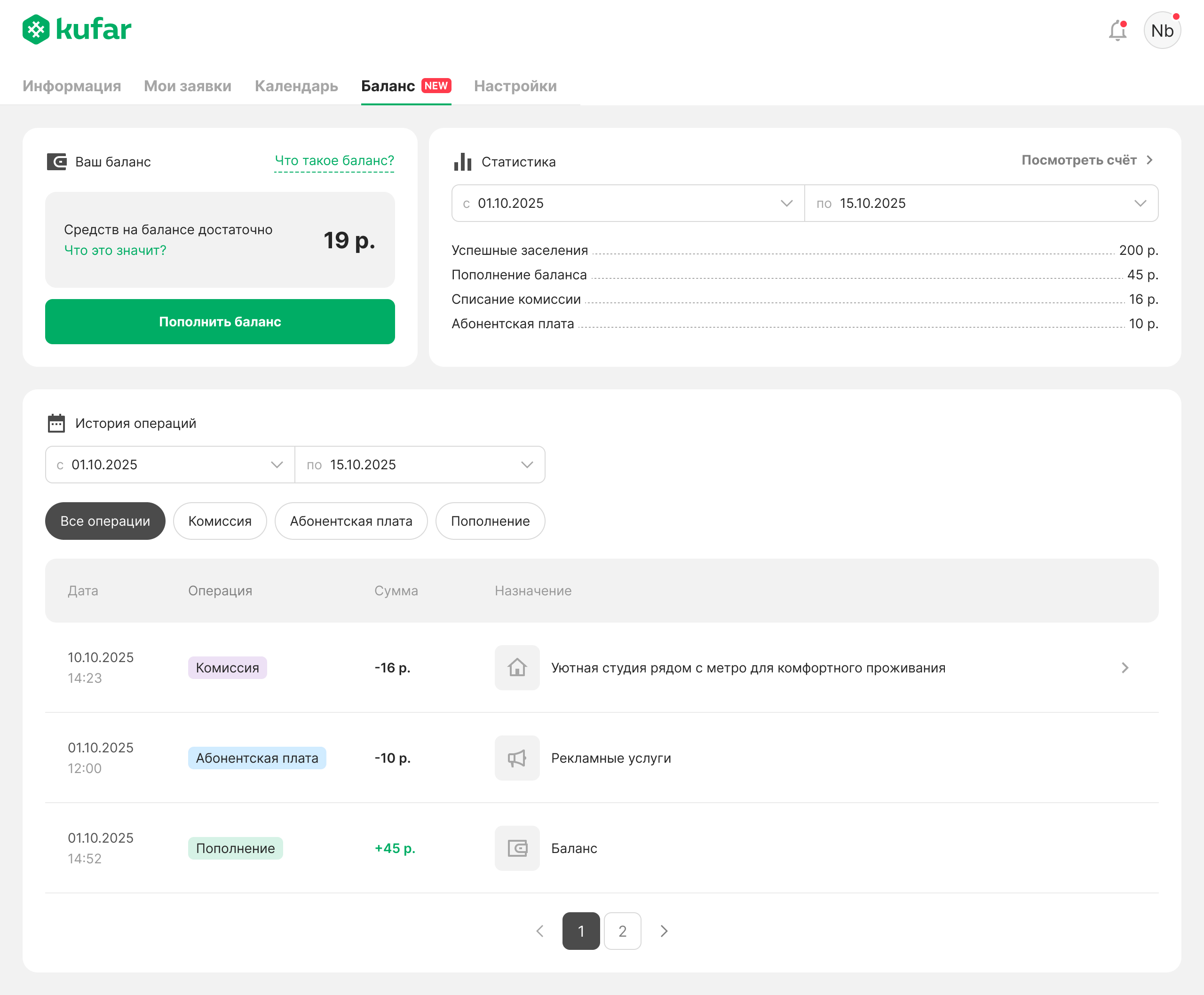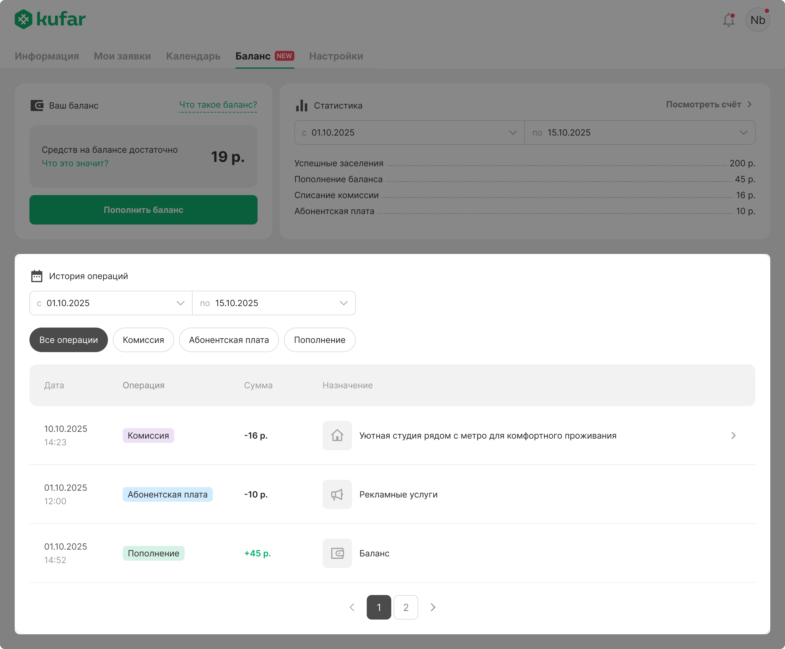 «Баланс» — это ваш счёт в Куфар Путешествиях, с которого будут списываться абонентская плата и комиссия.
