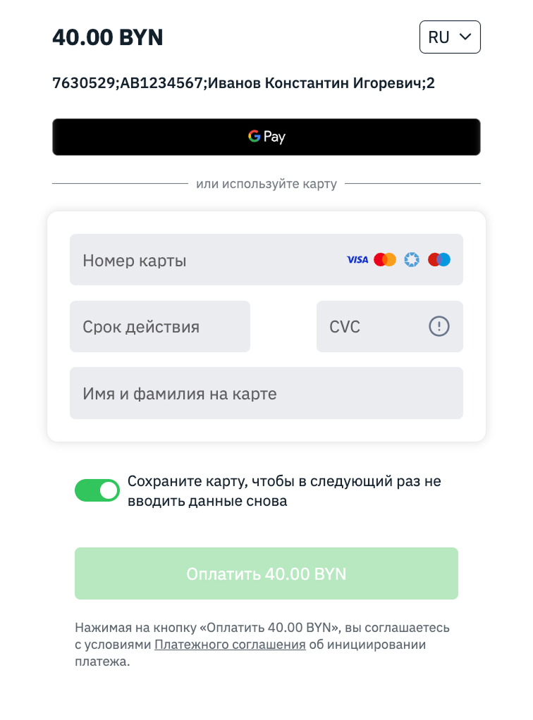 Если вы выбрали оплату картой, следующим шагом введите данные карты, и нажмите «Оплатить»: