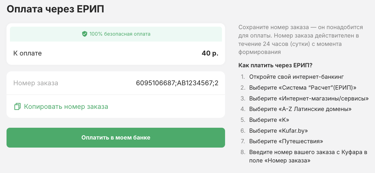 Если вы выбрали оплату через ЕРИП, следующим шагом скопируйте номер заказа, нажмите «Оплатить в моем банке» либо перейдите в ваш интернет-банкинг самостоятельно, выберите Система «Расчёт» (ЕРИП) – «Интернет-магазины/сервисы» – «A-Z Латинские домены» – «K» – «Kufar.by» – «Путешествия», и далее вставьте номер вашего заказа, и нажмите «Оплатить» :
