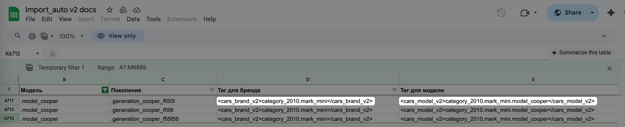 6. В результате отобразятся значения параметров только для выбранной вами марки и модели. Вы можете скопировать теги с параметрами внутри и добавить их в свой файл импорта: