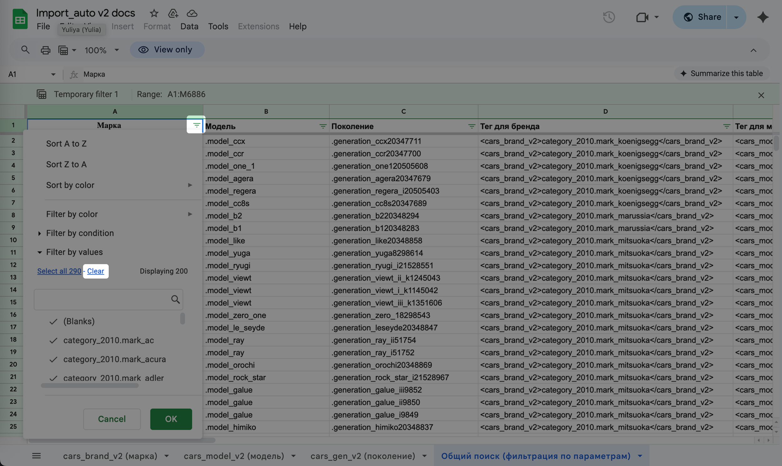 Как быстро найти все значения для марки, модели и поколения