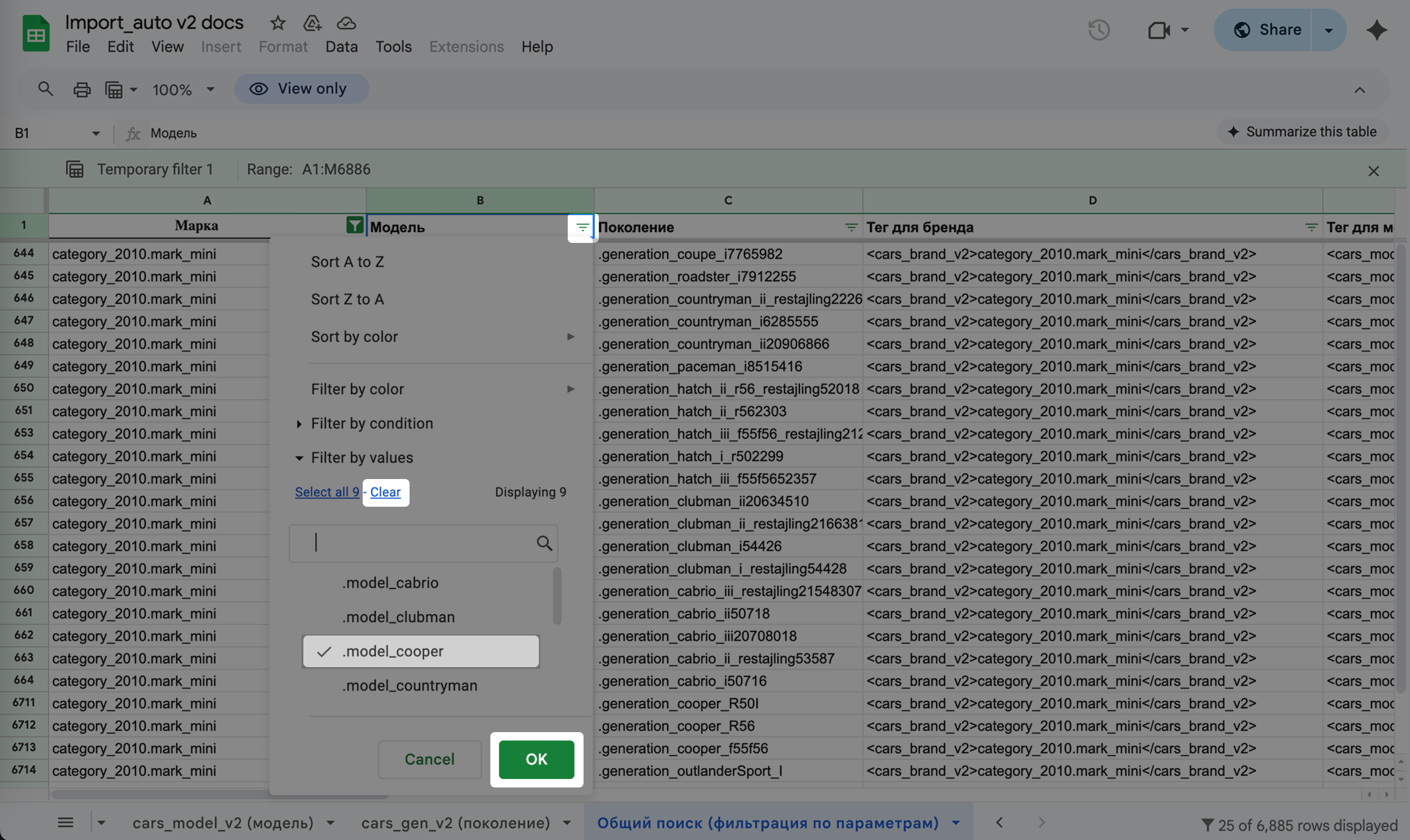4. Проделайте всё то же самое с колонкой «Модель»: нажмите изображение фильтра -> снимите выделение со всех значений -> выберите нужное -> нажмите «ОК»: