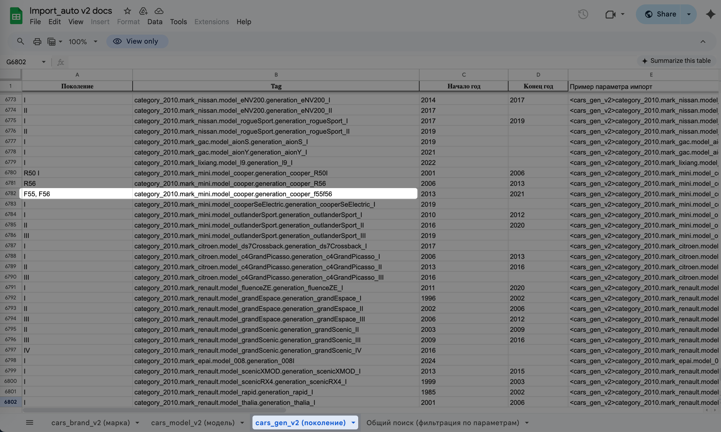 3. Чтобы указать поколение, открываем вкладку «cars_gen_v2 (поколение)» , находим марку MINI, модель Cooper и видим информацию о том, как указать то или иное поколение. Если хотим указать поколение F56, то в тегах <cars_gen_v2></cars_gen_vs> указываем значение category_2010.mark_mini.model_cooper.generation_cooper_f55f56.