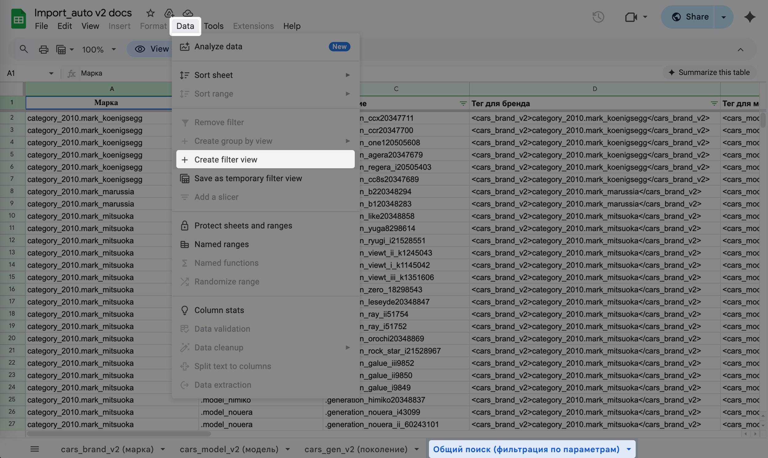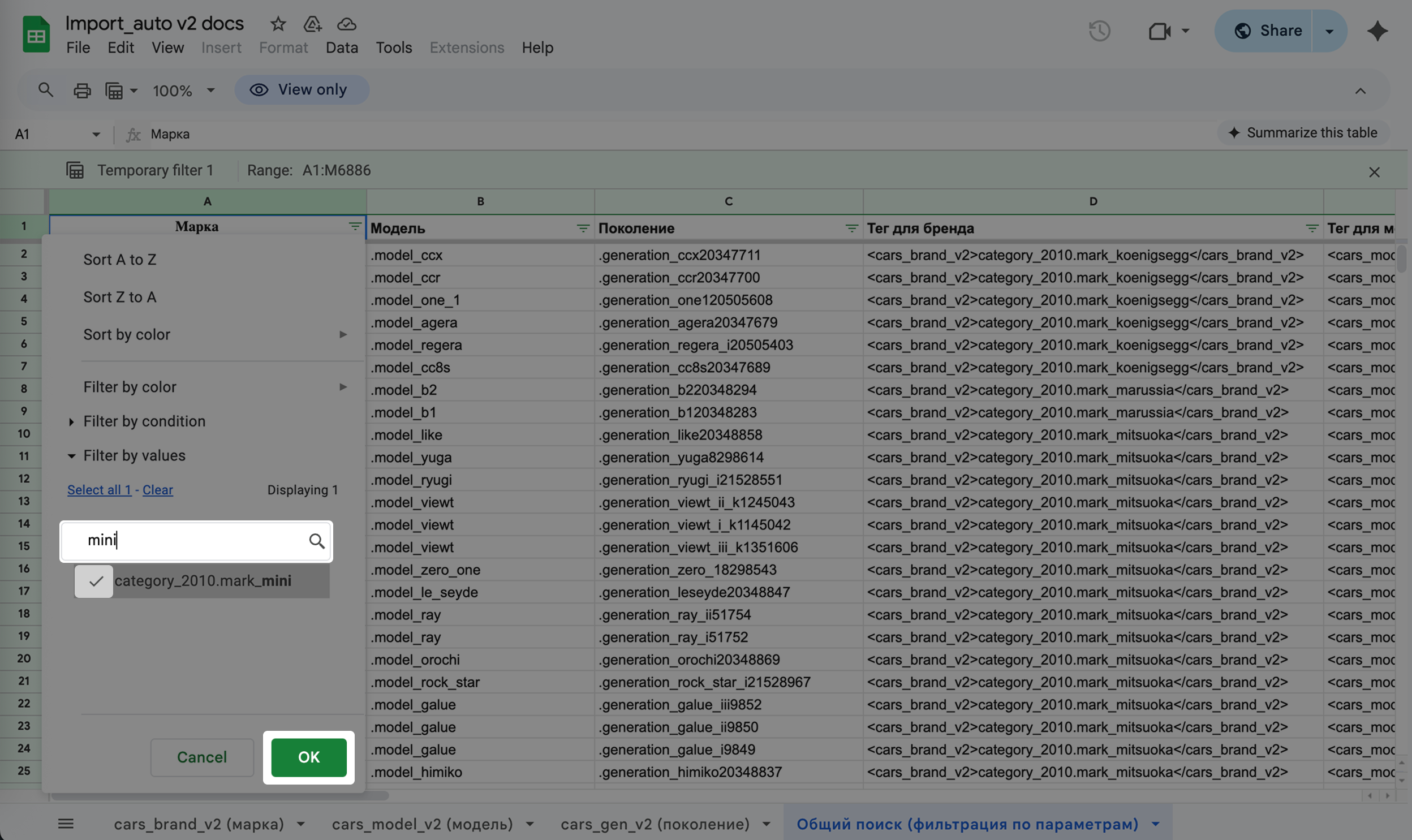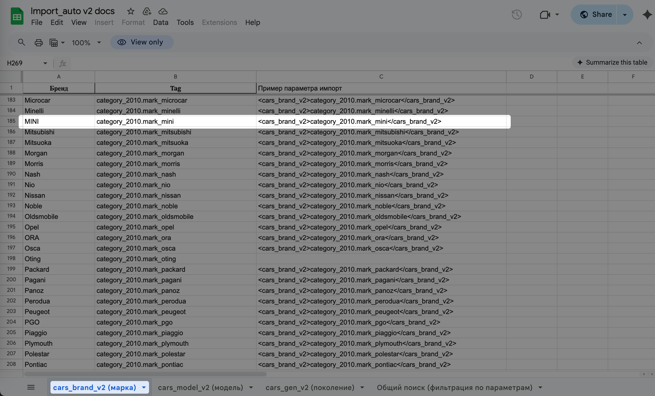 1. В таблице во вкладке «cars_brand_v2 (марка)» находим марку MINI, для более быстрого поиска можно нажать ctrl + F и ввести в появившуюся строку поиска «MINI». Отобразится информация о том, что если нужно указать MINI, то в тегах <cars_brand_v2></cars_brand_v2> нужно вводить значение category_2010.mark_mini.