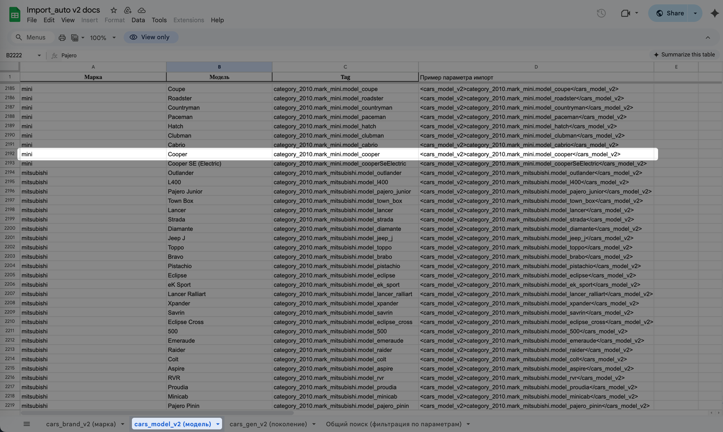 2. Если дополнительно хотим указать модель, то заходим во вкладку «cars_model_v2 (модель)», находим марку MINI и видим информацию о том, как указать ту или иную модель. Если хотим указать модель Cooper, то в тегах <cars_model_v2></cars_model_v2> указываем значение category_2010.mark_mini.model_cooper.