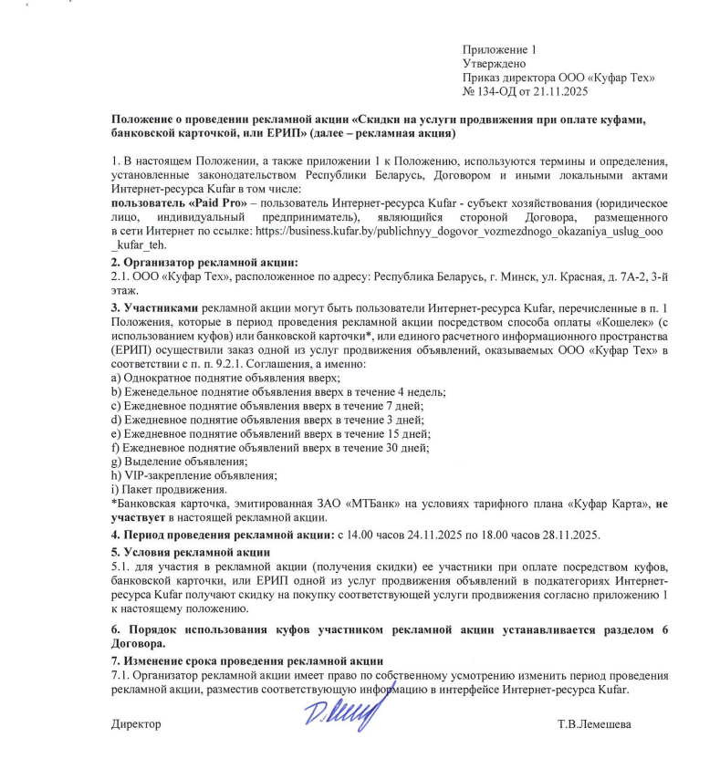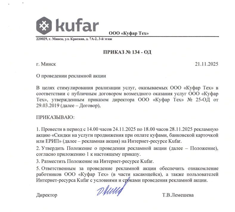 Приказ о проведении рекламной акции в период с 14.00 24.11.2025 по 18.00 28.11.2025