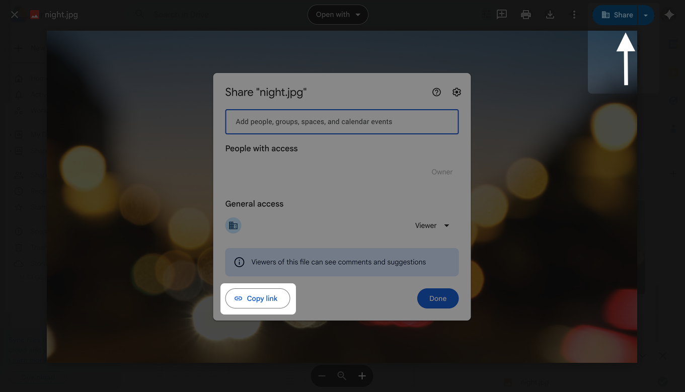 1. Получить ссылку на фото, для этого зайти в неё в Google Drive и выбрать опцию «Поделиться», после чего скопировать ссылку: