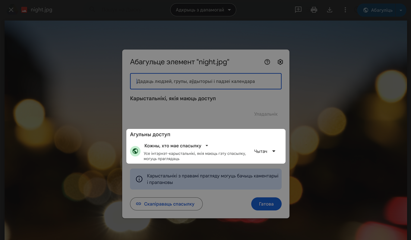 Фотография должна быть доступна всем, иначе мы не сможем её скачать. Убедитесь, что в правах доступа указан «Общий доступ» и все, у кого есть ссылка, могут просматривать файл: